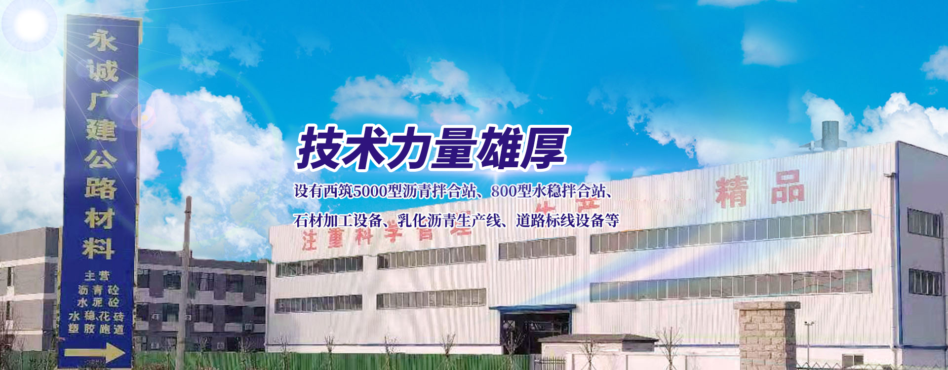 永誠廣建公路材料(山東)有限公司,坐落于商河縣賈莊鎮民營經濟創業園,設有西筑5000型瀝青拌合站、800型水穩拌合站、石材加工設備、乳化瀝青生產線、道路標線設備等